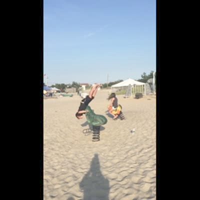 A boy rocks back and forth on a playground structure on a beach and rocks too hard and flips himself over the front of it and falls face-first into the sand.