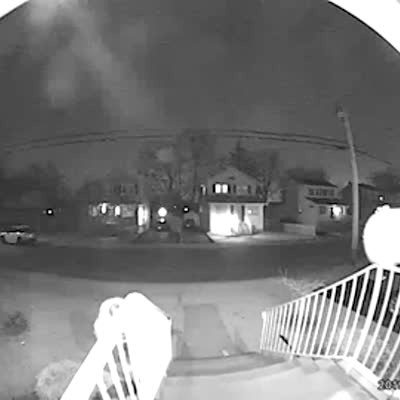 A man at a front door goes wave to someone at night and loses his balance and falls over a railing. A woman tries to grab his legs but she slips and he flips over the railing.