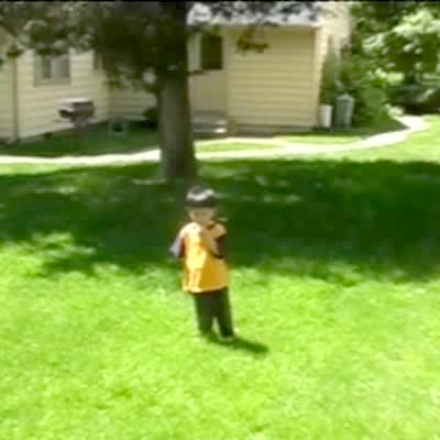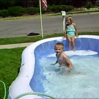 2 boys try to flip into inflatable kiddie pool in the front yard. 1 boy flips over & lands on his head.