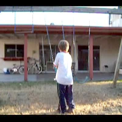 Young boy does a front flip off of a swing and lands face first in the grass.