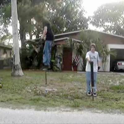 Teen boy jumps on pogo stick in front yard and tries to flip onto another pogo stick. He misses it by an inch and hits himself hard in the stomach / gut.