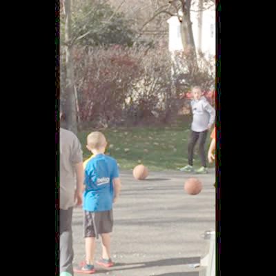 A young girl does a front flip basketball three point shot and makes it, outdoors. AA: Basketball Trick Shots. Short tail.