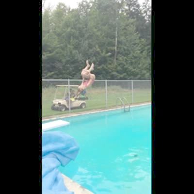 A young boy falls off of the back of a golf cart when he stands up and says "That's so cool" as a teen boy drives the golf cart after a young girl does a front flip dive off of a diving board in to a swimming pool.