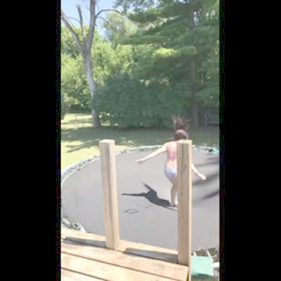 A teen girl jumps from a pool deck onto a trampoline and does a front flip. Then she runs back onto the deck to jump into the pool, but slips and falls in instead.