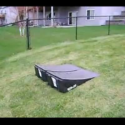 Boy rides over a skateboard ramp in a child's pink wagon. He flips over the front of the wagon & rolls down grassy hill. With recovery.