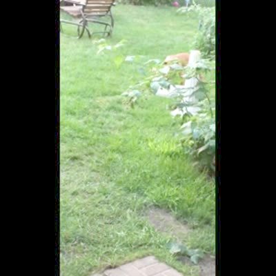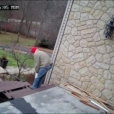 A man sees a wasp as he sandpapers the front of a house. He runs from it into the front yard and does a flip on the ground. Security Footage.