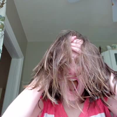 A teen girl films herself dancing and bangs her head in front of the camera when she flips her hair.