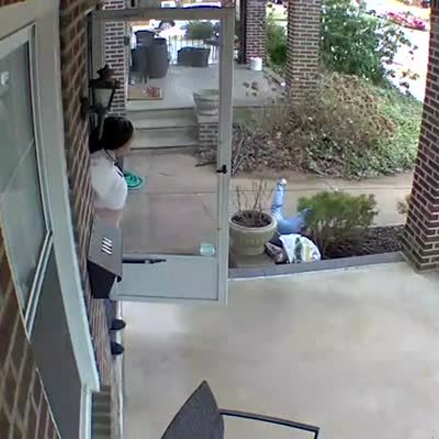 A young girl twirls on a front porch when a door swings open and hits her as she flips backwards off of the porch. Security footage. Featured talent cleared only (the woman, the young girl and the baby).