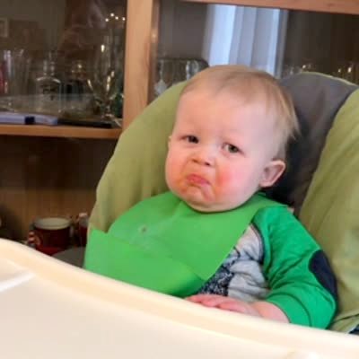 A tot boy frowns at the dinner table when a woman burps loudly, scaring the boy and causing him to smile.