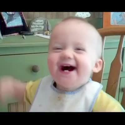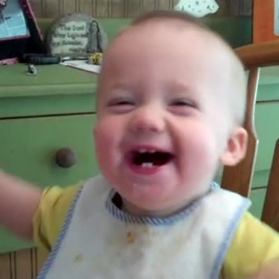Baby boy in booster seat frowns, furrows his brow at camera and claps. Funny faces.