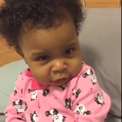 A baby girl shows her mom her "mad face" indoors. Vine/Instagram video.