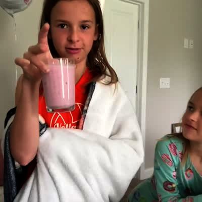 A woman receives breakfast in bed from two young girls and a tot girl. One young girl says that she made the bacon and the other young girl says she made the smoothie. The tot girl frowns and says "I didn't make anything."