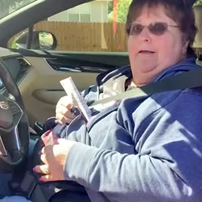 "Befuddled by the Buckle" A senior woman says that she is stuck in her seatbelt in the car and has tried many different methods to press on it, but she presses on the wrong side of the seatbelt. The woman behind the camera asks her what hand she used to buckle the belt, then the senior woman finds the seatbelt button with her other hand. She frowns, laughs, and says "well, that's really stupid."