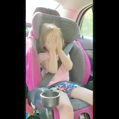 A young boy cries in his car seat, and his visibly frustrated older sister yells "I want peace and quiet!"