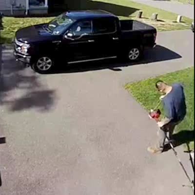 A man tries to start a motorized weed-whacker tool in a front yard but fails repeatedly and gets frustrated. He curses and yells and smashes the weed-whacker against the ground repeatedly.