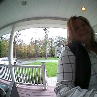 A woman falls onto her back when she walks up the porch steps, and says "I'm on the ground". Then she struggles to open the front door and talks about how the camera recorded her fall. Security footage.