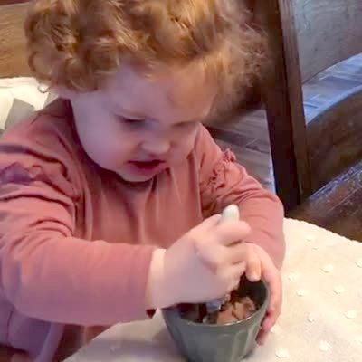 A tot girl grunts as she stabs a bowl of ice cream with a spoon to get a small bite. She gets frustrated and throws down the spoon, then pouts at the kitchen counter.