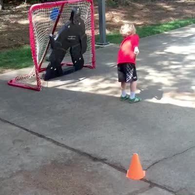 A tot boy hits a ball with a hockey stick into a goal, but a goalie dummy is in the way and the boy angrily attacks it.