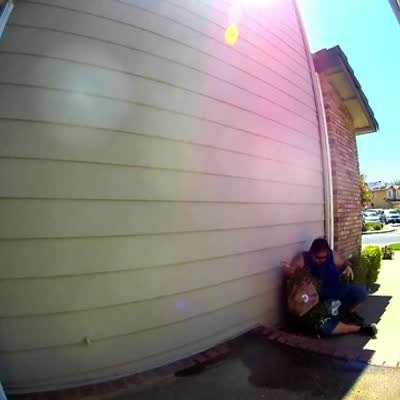 A man trips and falls and drops his lunch as he comes home. Security footage.
