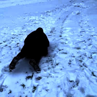 A man shovels snow on the driveway, until a tree branch breaks and dumps snow on the driveway again. Security footage.