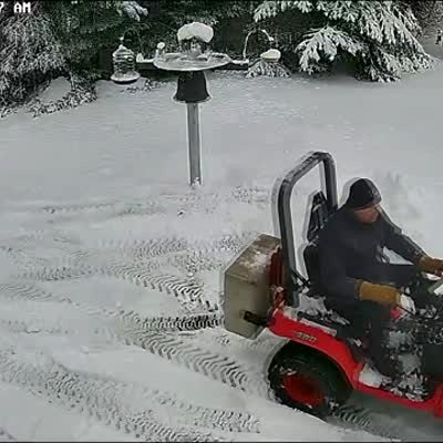 A man rides a snow blower in his backyard. He accidentally runs into a bird feeder and knocks it down. Security Footage.