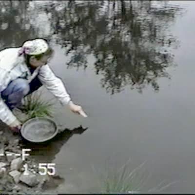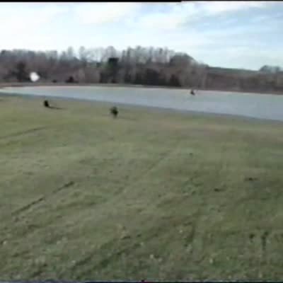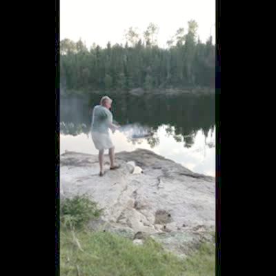 A senior man carries a large pan with a large flame on it towards a lake, but he trips and falls into the water. The flames shoot up even higher when the pan lands in the water.
