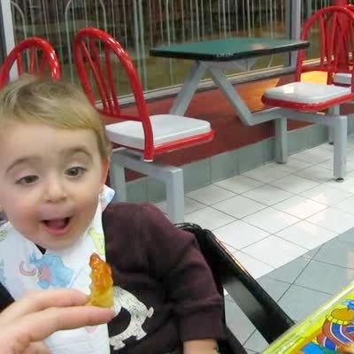 Tot boy has a surprised look on his face when he tastes ketchup on a French Fry at a restaurant. First foods.