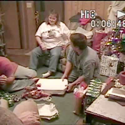 "Frying Pandemonium" 2 men hit each other with wrapping paper on Christmas morning. 1 man hits the other in the head with a heavy box, he opens it and there's a frying pan inside.