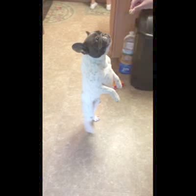 A french bulldog dog walks on its two hind back legs in the kitchen to eat a french fry.