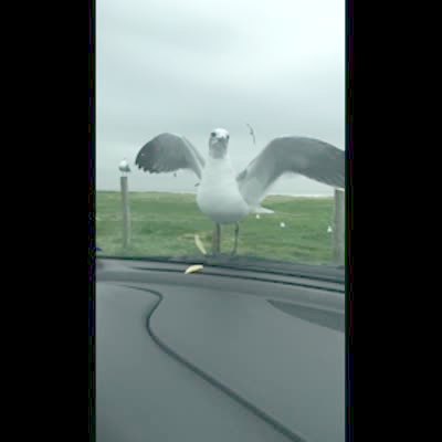 A man puts a French fry through the sunroof of his car to feed a seagull bird but the bird flies into the car and gets stuck. He screams and a woman screams and laughs and says the bird pooped inside of his car.