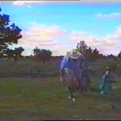 Man tees off, golf ball comes back somehow and hits him. He says, "Ow, fuck!" and hops away.