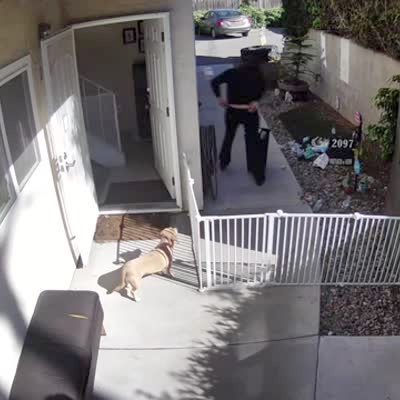 A puppy dog runs full speed into a glass door on a porch. Security footage.