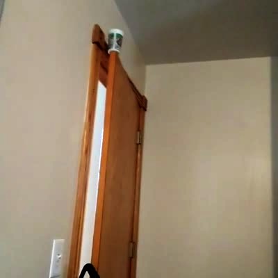 A man sets a cup full of water on top of a door in the bedroom and calls his son to the room to prank him. The boy opens the door, but the cup doesn't fall on him.