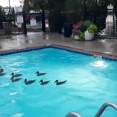 A teen boy and a teen girl throw a ball back and forth across a swimming pool full of ducks. The duck birds swim back and forth with the direction of the ball.