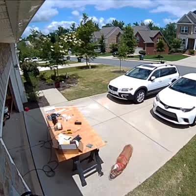 A Bulldog dog on a leash follows a man into a garage and breaks a table full of work tools in a driveway. Security camera footage.