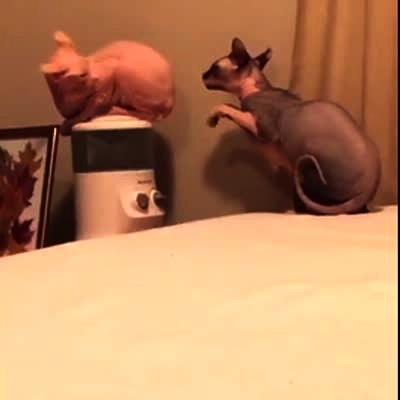 A hairless cat howls at another hairless cat before he slips and falls off a chair indoors.