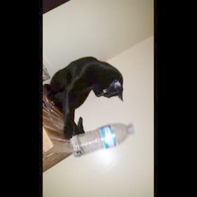 A cat pushes a water bottle off a table even when his owner tells him not to.