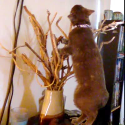 A cat climbs on sticks in a vase. A second cat pushes the vase over and it and the cat fall to the floor.
