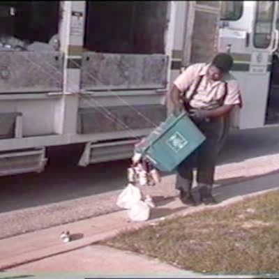 Security camera footage of a man who rolls a trashcan down the driveway after the garbage truck passes his house, so he starts to roll the trashcan up the hill to chase the truck.