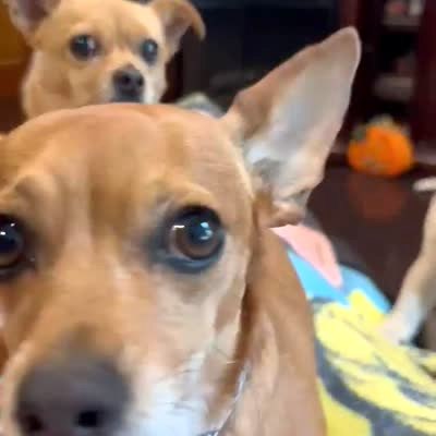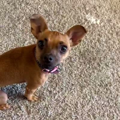A dog lies on her back. A woman gasps at her. The dog jumps up quickly and perks up her ears. Gasp at Your Dog Challenge