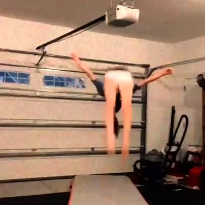 A teen girl does several flips on a gymnastics mat in the garage, then kicks the garage door opener on the ceiling and breaks it.