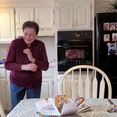 A senior woman opens a birthday box, then paper butterflies pop out of it and she gasps loudly in a kitchen.