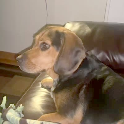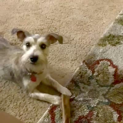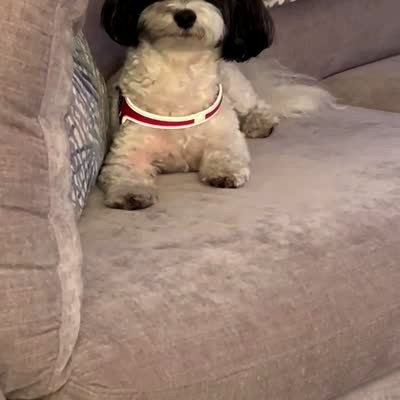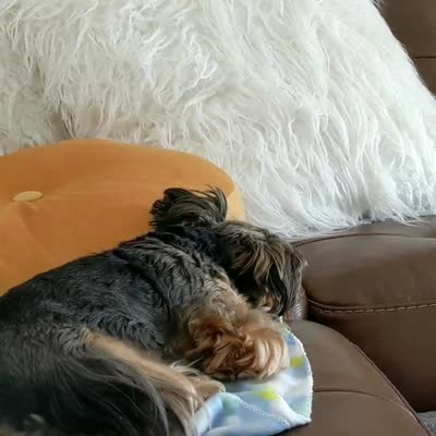 A small terrier dog sleeping on a couch hears a woman gasp and bolts up, excited. Gasp at Your Dog Challenge