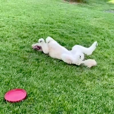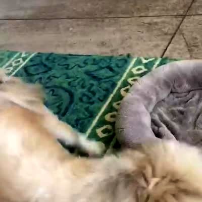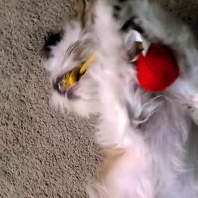 A Shih Tzu puppy dog lies on his back and plays with a toy at home. Then a woman gasps, and the dog drops the toy and jumps to his feet. Gasp At Your Dog Challenge