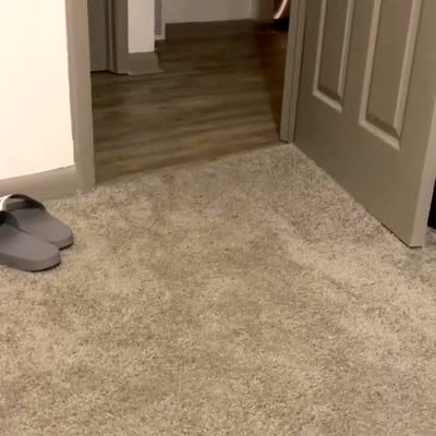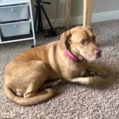 A dog walks into a room. A woman gasps. The dog looks up, alert. The woman gasps again and the dog runs away. Gasp at Your Dog Challenge