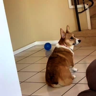 A woman gasps at a corgi dog who sleeps on the floor at home, and the dog barks quietly and sits up.