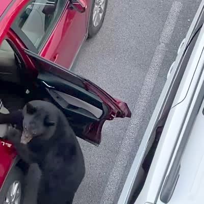 A bear opens the back door of a car in a parking lot and climbs inside.