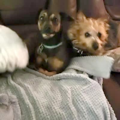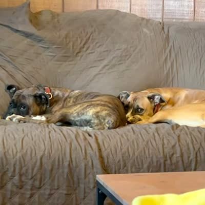 Two dogs sleep on a couch. A woman gasps. The dogs get up at the same time and run off the couch. Gasp at Your Dog Challenge