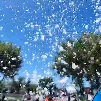 A woman gasps while foam covers her and knocks over a Jenga tower onto her at an outdoor event. Featured talent only (African American woman who knocks over the tower)