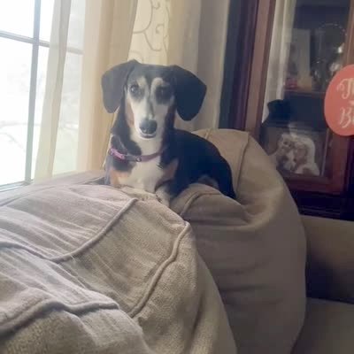 A woman gasps at a dog that lies on a couch. The dog perks up quickly. Gasp at Your Dog Challenge